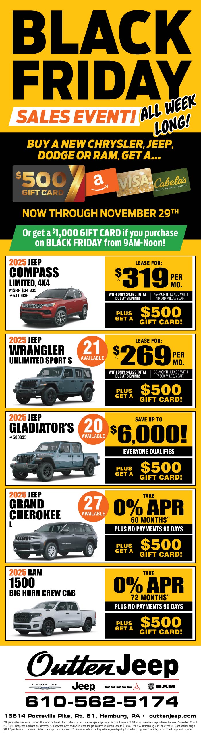 Purchase a shiny new Chrysler, Dodge, Jeep, or RAM between 11/24 and 11/29, and you'll pocket a $500 gift card! But wait, there's more! Purchase on Black Friday between 9am and noon, and you'll double the fun with a $1,000 gift card!